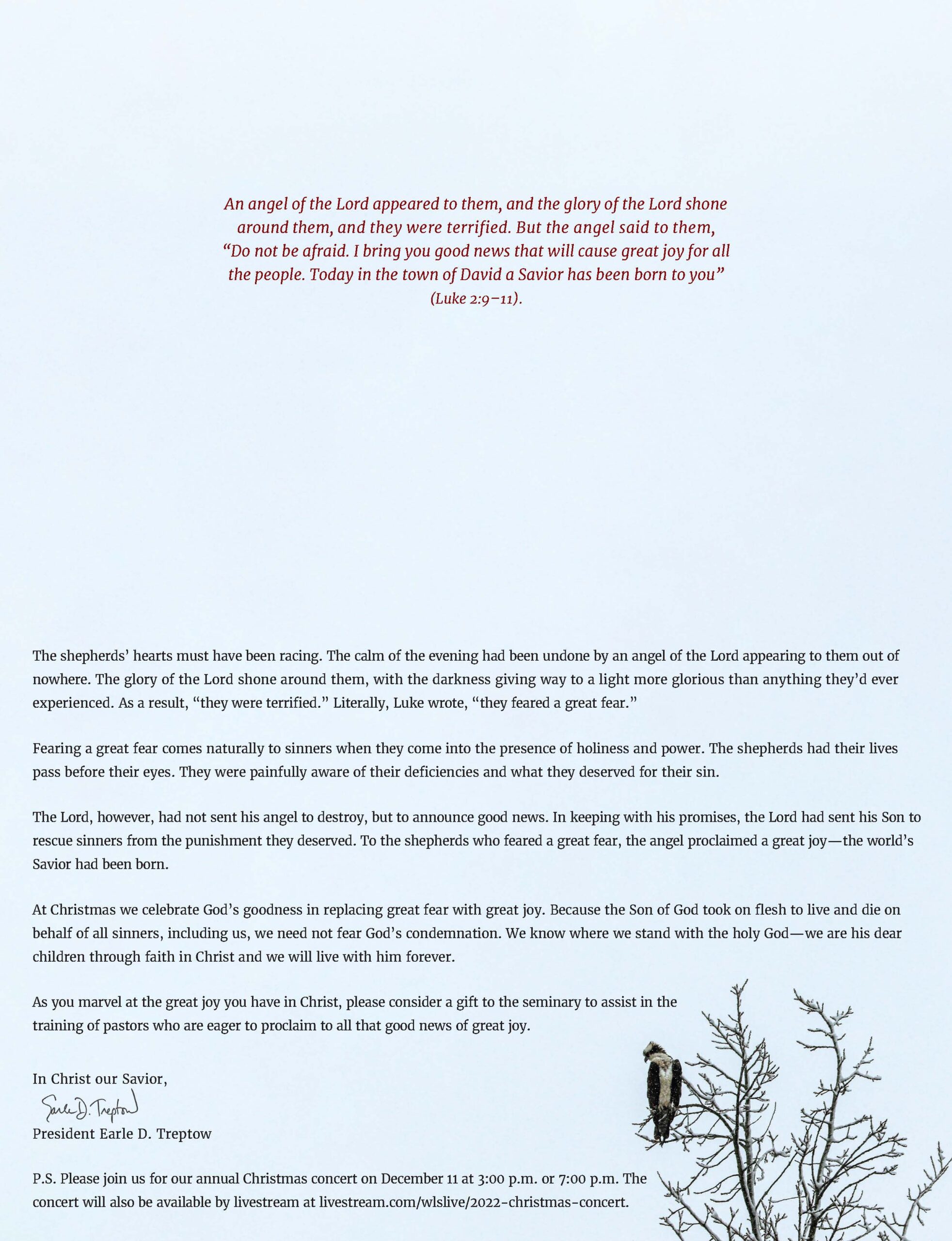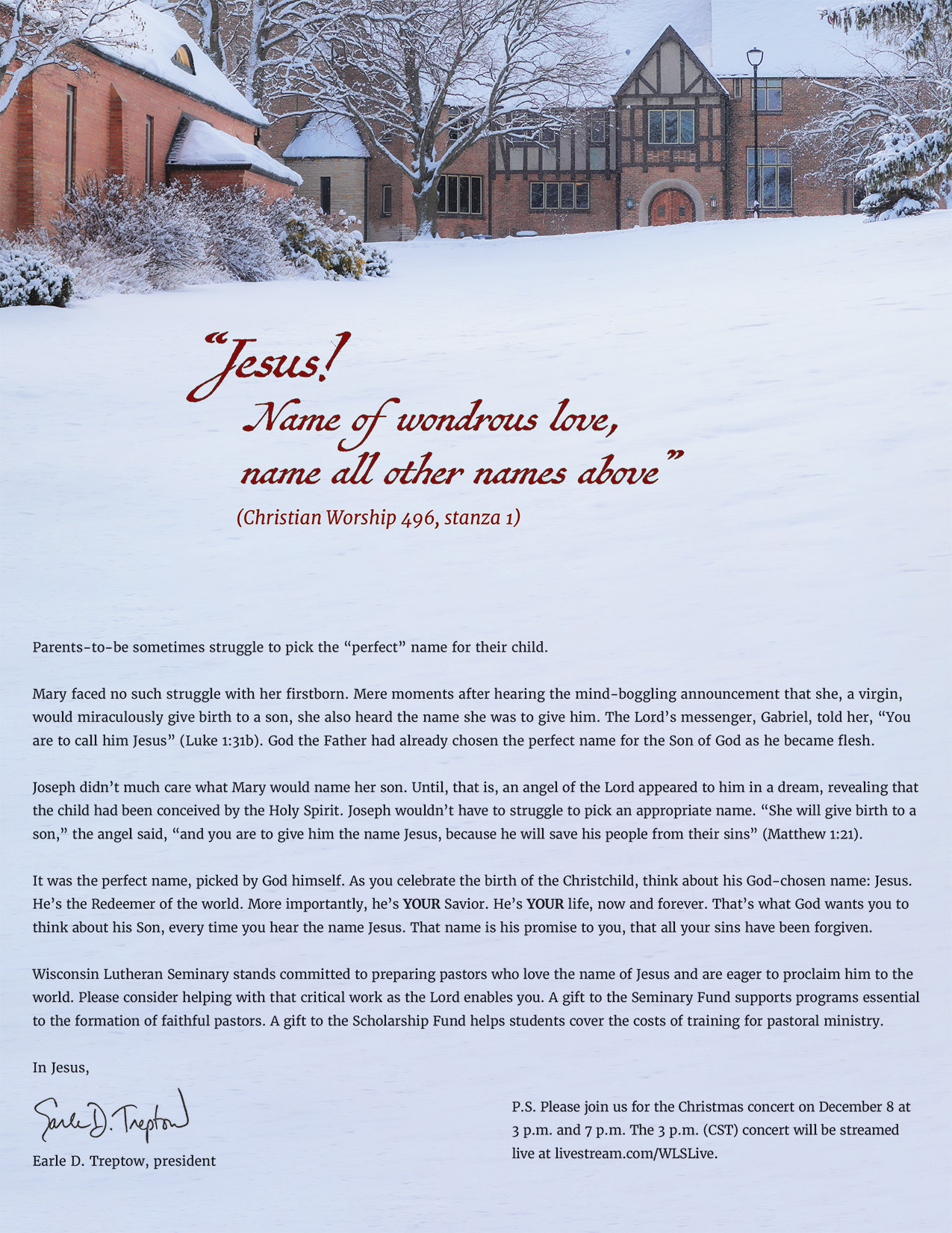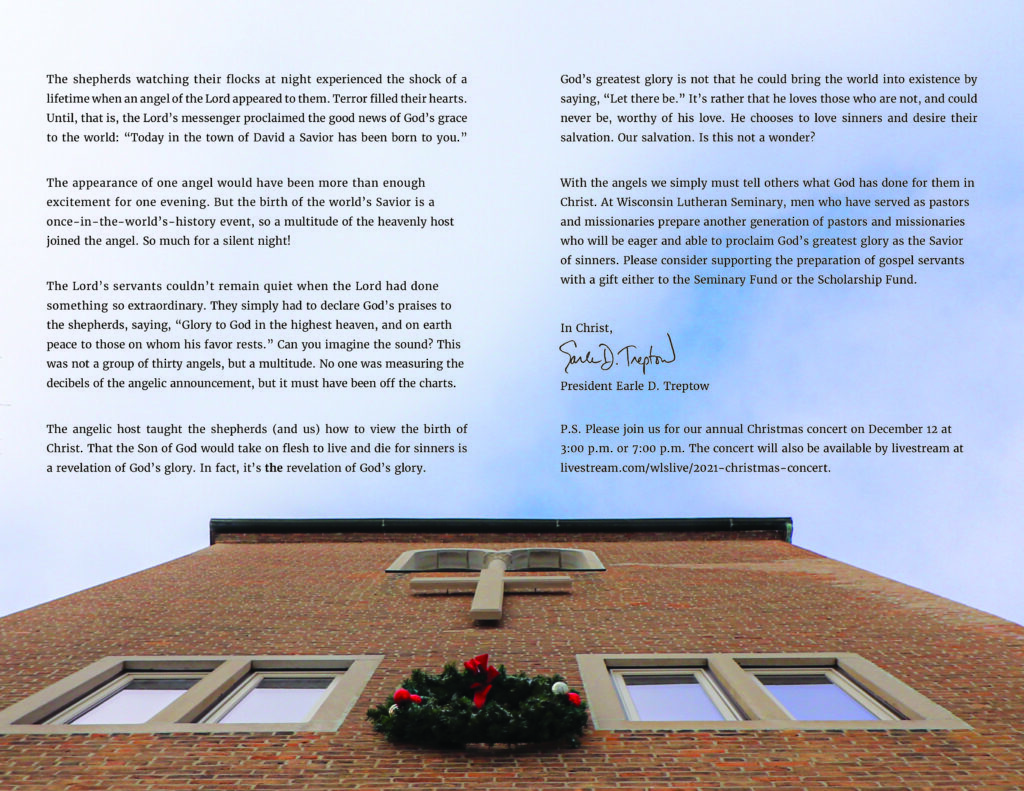 A Christmas card from President Treptow was mailed this month to friends and supporters of Wisconsin Lutheran Seminary. In his letter, he reminds us that the baby wrapped in cloths was not just a sign for those shepherds long ago but also a sign for us today. A sign of God’s love for us and commitment to us.