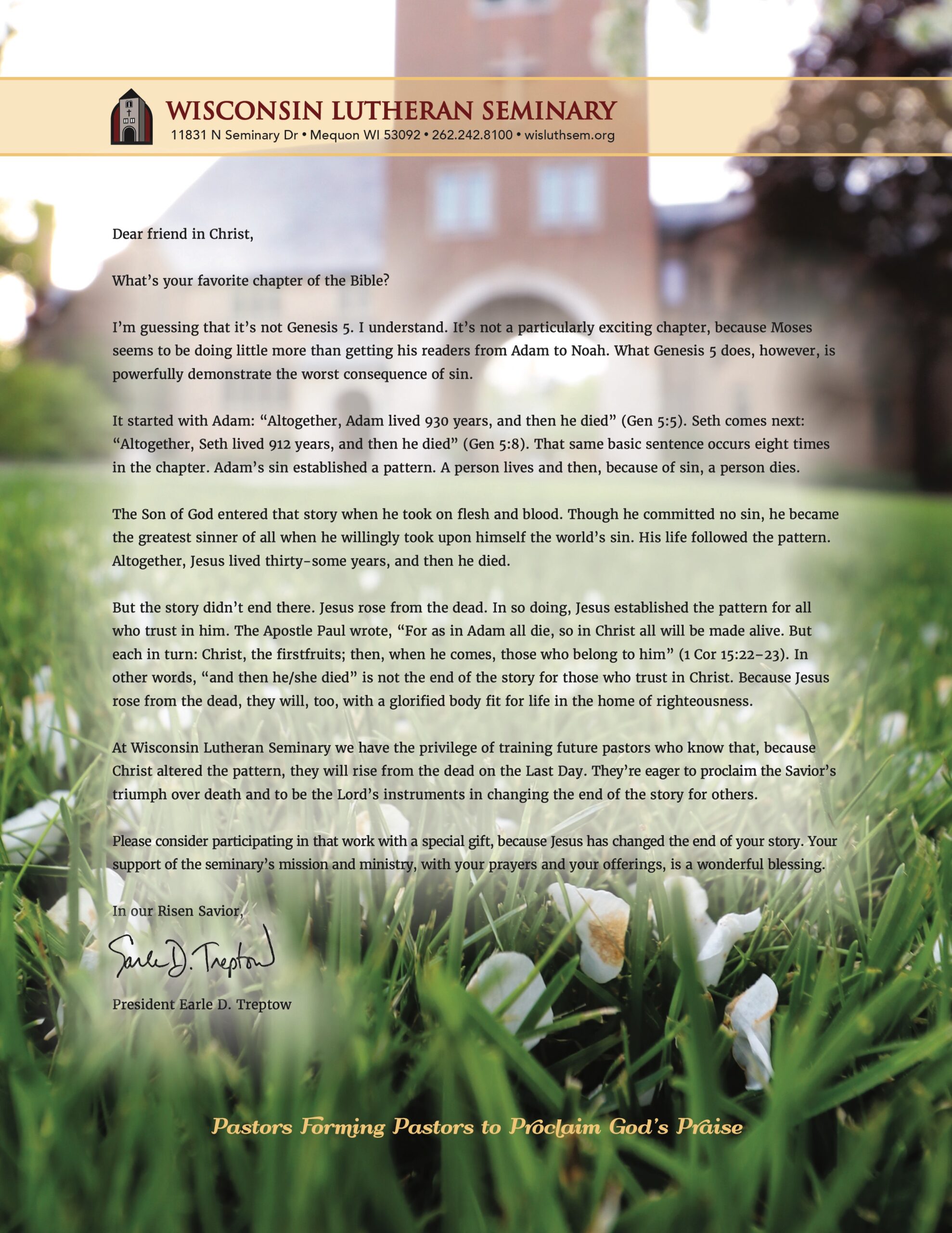 A letter from President Treptow, reminding us that Christ took on flesh and blood for us, was mailed recently for Easter.