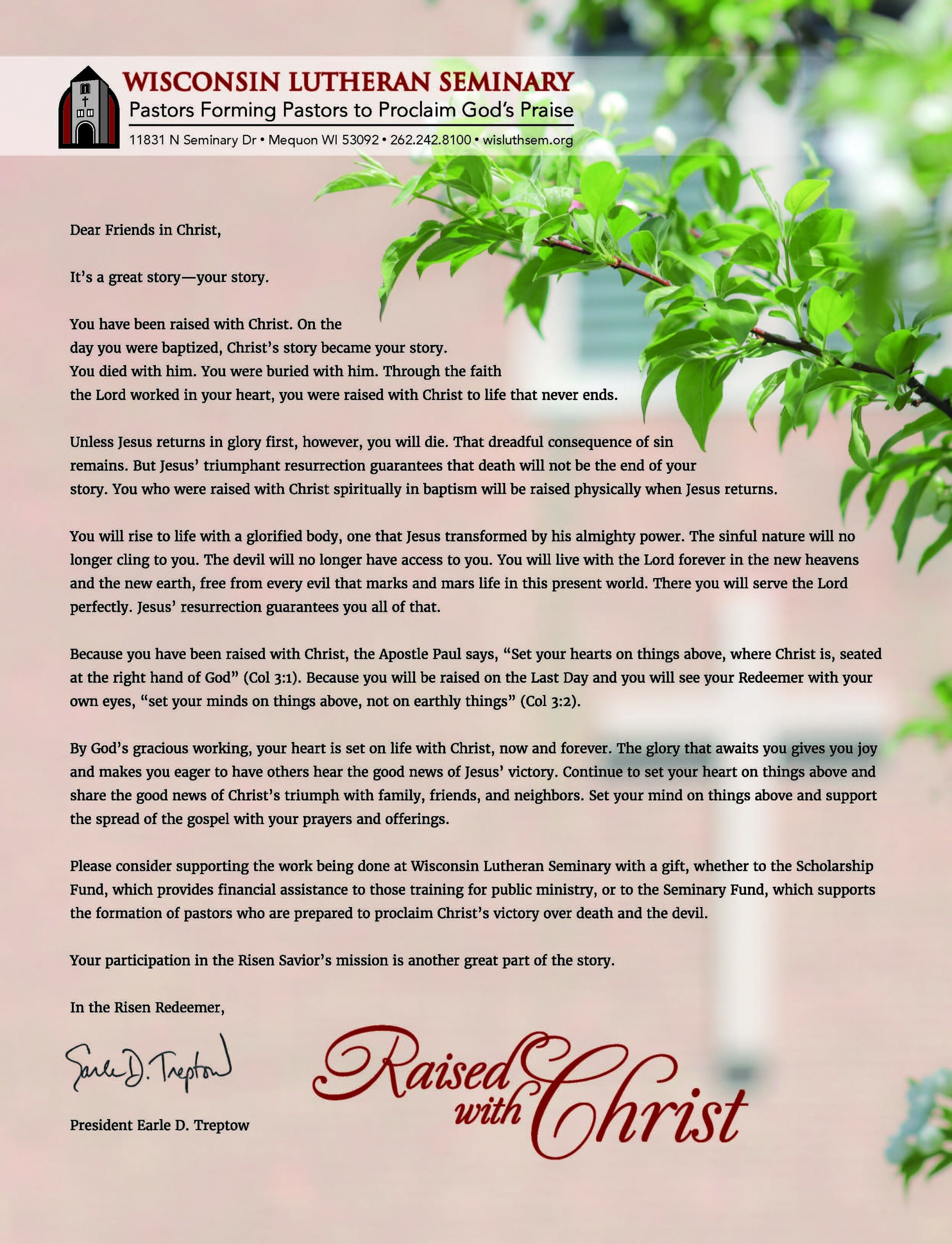 A letter from President Earle Treptow, reminding us that Christ took on flesh and blood for us, was mailed recently for Easter.