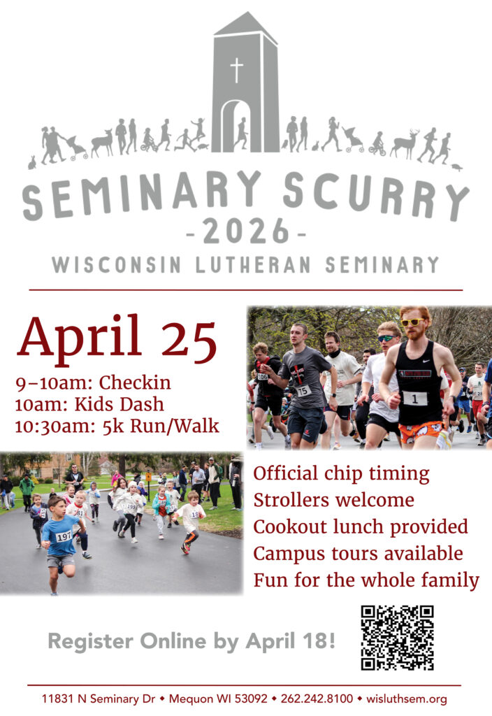 You are invited to take part in the tenth Seminary Scurry! Our annual 5k and 1/2 mile Kids Dash will take place the morning of April 25th. Check-in begins at 9am and the Kid’s Dash at 10am with the 5k starting at 10:30am.